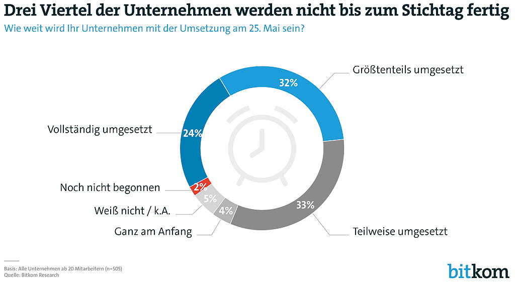Eine Bitkom Befragung zeigte ganz klar (vgl. Grafik): Nur ein Viertel der vorwiegend mittelständischen Unternehmen konnte wohl die weitreichenden Datenschutzrichtlinien pünktlich umsetzen. Das verwundert nicht: Es fehlt ihnen im Tagesgeschäft mehrheitlich an zeitlichen und personellen Ressourcen, an entsprechender inhaltlicher und juristischer Spezialisierung sowie Planungs- und Umsetzungskompetenz. 58 Prozent der Unternehmen in Deutschland hielten den Aufwand für die Umsetzung außerdem für zu hoch. Jedes zehnte deutsche Unternehmen sieht durch die DSGVO sogar Gefahren für ihr Geschäftsmodell.
