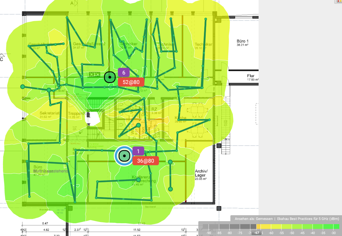 Häufig wird diese Bewegungsfreiheit durch eine schlechte Positionierung, oder fehlerhafte Konfiguration der Access Points eingeschränkt. Um einen reibungslosen Ablauf Ihrer Geschäftsprozesse zu gewährleisten, benötigen Sie ein leistungsfähiges/-starkes flächendeckendes WLAN. Unabhängig davon, ob Sie ein WLAN bereits implementiert oder eine Neuinstallation planen, können wir mit einer WLAN-Ausleuchtung und einer produktneutralen Beratung ein maßgeschneidertes WLAN-Konzept entwickeln. Mit Hilfe der professionellen Software des Herstellers Ekahau werden die Access-Points-Positionen unter der Berücksichtigung von Signal-Ausbreitung und -stärke, Datenraten, Signalrauschabstand und Kanalverteilung simuliert und geplant. So sind wir in der Lage die Schwachstellen systematisch zu lokalisieren und zu beseitigen.in ausgeschlossen.